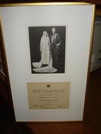 SOLD 3097 -Here is the first sample of the invitation to the wedding of Charles and Diana in 1981. This sample came directly from the London printers who did the original wedding invitations. This sample was rejected for the one listed below. This invitation reads: ER, The Lord Chamberlain is commanded by the Queen and the Duke of Edinburgh to notify --------- of the marriage of The Prince of Wales to Lady Diana Spencer in St. Paul's Cathedral on Wednesday 29th July 1981 at 11:00 a.m. An answer is requested to the Lord chamberlain St. James Palace, L. W.I. As this invitation will not admit. Dress: Morning suit (or lounge suit) Serving Officers: Ceremonial day dress Ladies: Day dress with hat. This is the only sample invitation I have seen in the 27 years since the wedding took place. Nicely matted and framed. 9" X 11" $2,295.00 SOLD