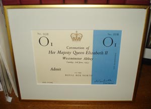SOLD - This is truly a piece of history. It is ticket number 008. 60 years old. It states: Coronation of Her Majesty Queen Elizabeth II, Westminster Abbey, Tuesday, 2nd June, 1953. Admit (no name) to the royal Box North, , Norfolk, Earl Marshal. It is framed under-non-glare glass. (9" X 11") The reverse shows the seating are for the Coronation. $995.00 SOLD