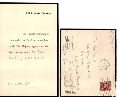 Item 3094 A rare 77 year old letter from the private secretary to King Edward VIII regarding a message from a boy scout troop. Few items remain from the short reign of King Edward VIII who gave up the throne to marry divorcee Wallis Simpson. This was sent 5 months before the abdication in 1936. Written on Buckingham Palace stationery with original envelope. $595.00 plus postage