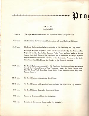 SOLD A 54 year old 8 page souvenir booklet of the visit of HRH Prince Philip to The Bahamas in 1959. A detailed day by day, hour by hour schedule of his visit. $549.00 plus postage